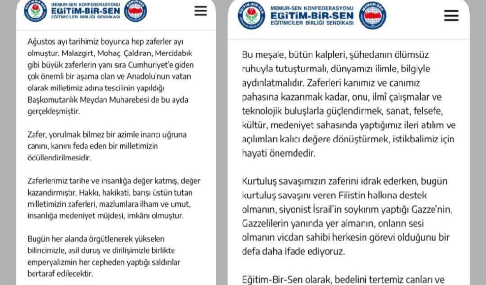 Eğitim-Bir-Sen olarak, bedelini tertemiz canları ve kanlarıyla ödeyerek Anadolu’yu milletimize vatan kılan şehitlerimizi ve gazilerimizi rahmet ve minnetle yâd ediyor; birlik ve beraberlik içinde başka zaferlere vesile olması temennisiyle milletimizin 30 Ağustos Zafer Bayramı’nı tebrik ediyoruz.