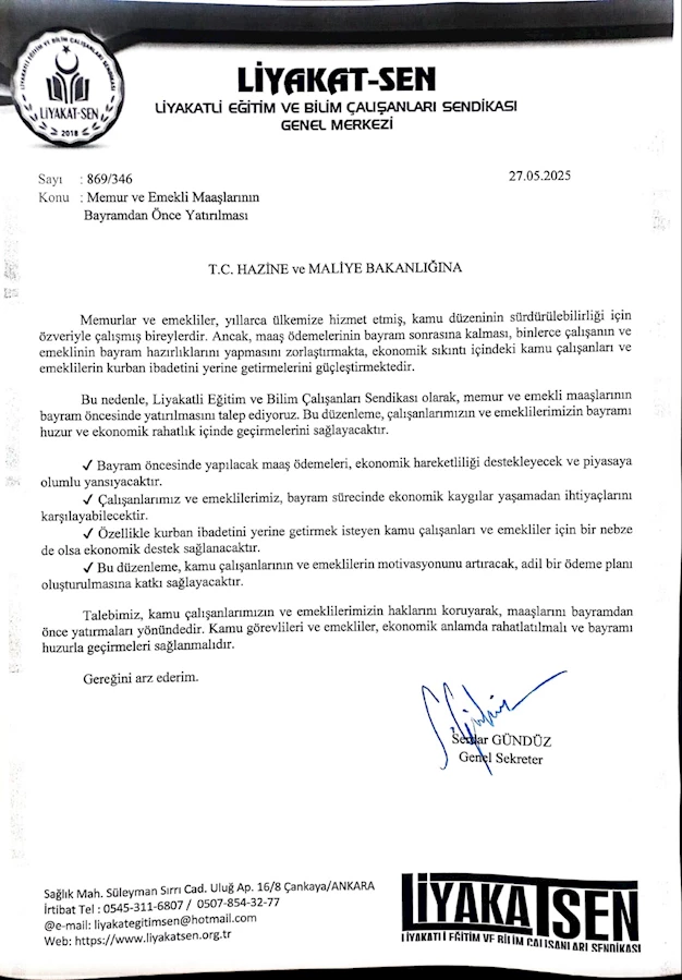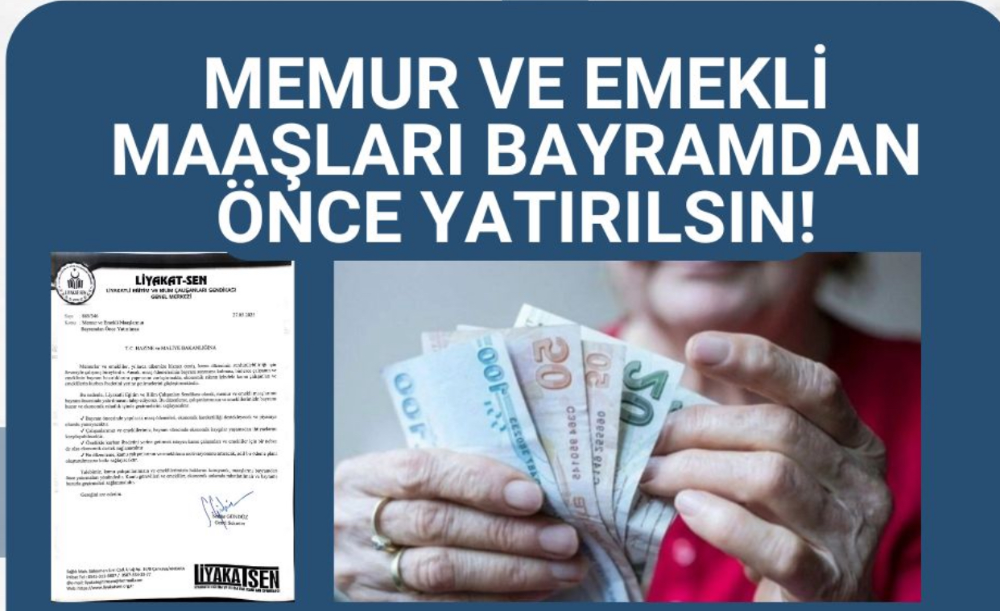 Yaklaşan bayram öncesinde memurlarımızın ve emeklilerimizin maaşlarını zamanından önce alması, ekonomik planlamalarını yapabilmeleri ve bayramı huzur içinde geçirebilmeleri açısından büyük önem taşımaktadır. Maaşların 15 Haziran beklenmeden, bayramdan önce yatırılmasını talep ediyoruz.