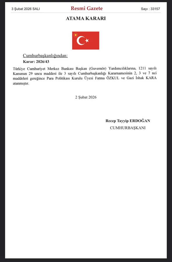 Cumhurbaşkanı Recep Tayyip Erdoğan'ın imzasıyla yayımlanan 2026/43 sayılı karara göre; Para Politikası Kurulu Üyesi Fatma Özkul ve Gazi İshak Kara, Merkez Bankası Başkan Yardımcılığı görevine getirildi. Söz konusu atamalar, 1211 sayılı Kanunun 29. maddesi ile 3 sayılı Cumhurbaşkanlığı Kararnamesinin ilgili hükümleri gereğince yapıldı.