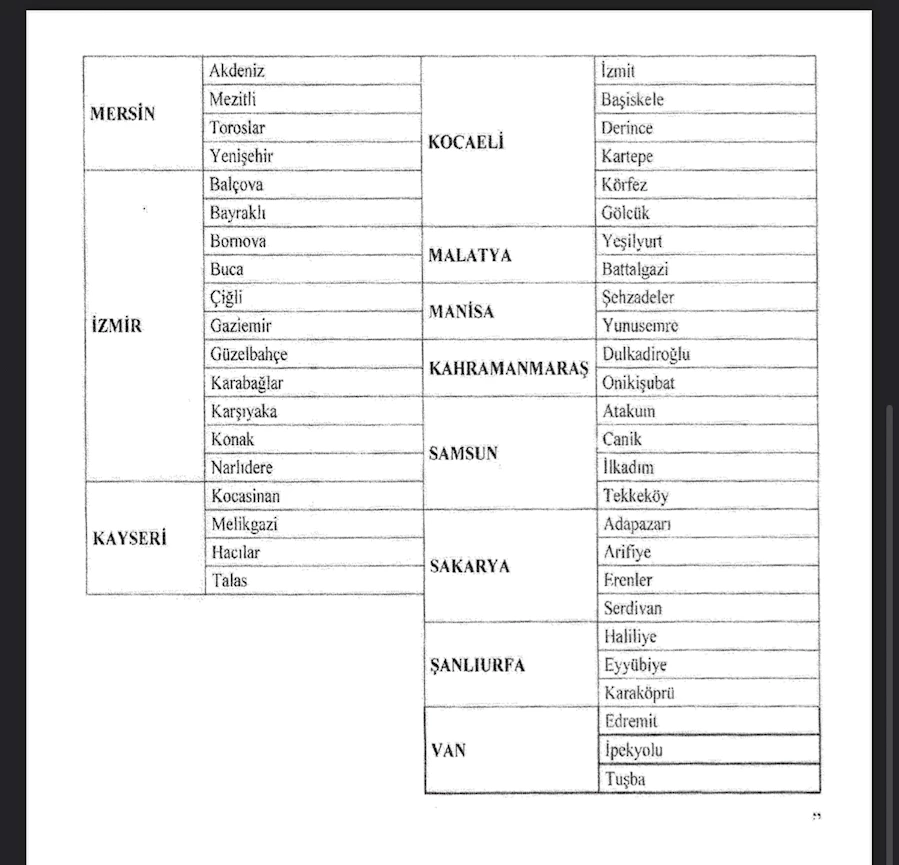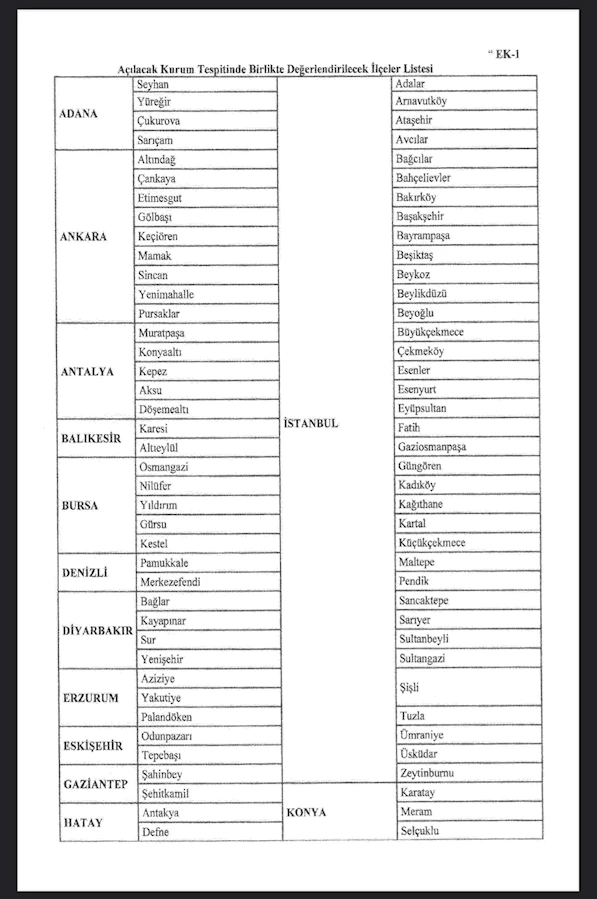 Ek olarak, Yönetmelik ekinde açılacak kurum tespitinde birlikte değerlendirilecek ilçeler listesi de güncellendi. Bu listeler, Adana, Ankara, Antalya, Balıkesir, Bursa, Denizli, Diyarbakır, Erzurum, Eskişehir, Gaziantep, Hatay, İstanbul, İzmir, Kahramanmaraş, Kayseri, Kocaeli, Konya, Malatya, Manisa, Mersin, Samsun, Sakarya, Şanlıurfa ve Van illeri için belirlenen bazı ilçe eşleştirmelerini içeriyor.