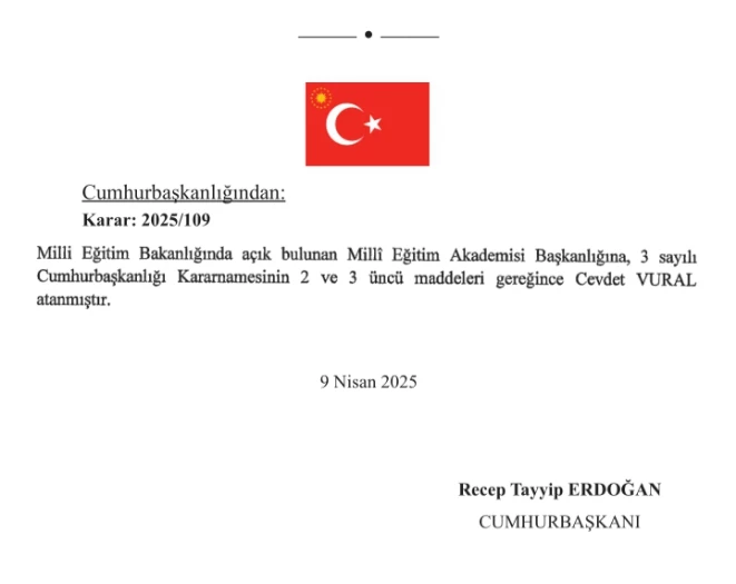 Cumhurbaşkanı Recep Tayyip Erdoğan'ın imzasıyla 10 Nisan 2025 tarihli Resmi Gazete'de yayımlanan kararnameyle Milli Eğitim Akademisi Başkanlığı görevine Cevdet Vural atandı. Bu atama, eğitim politikalarında yeni bir dönemin başlangıcı olarak değerlendiriliyor.