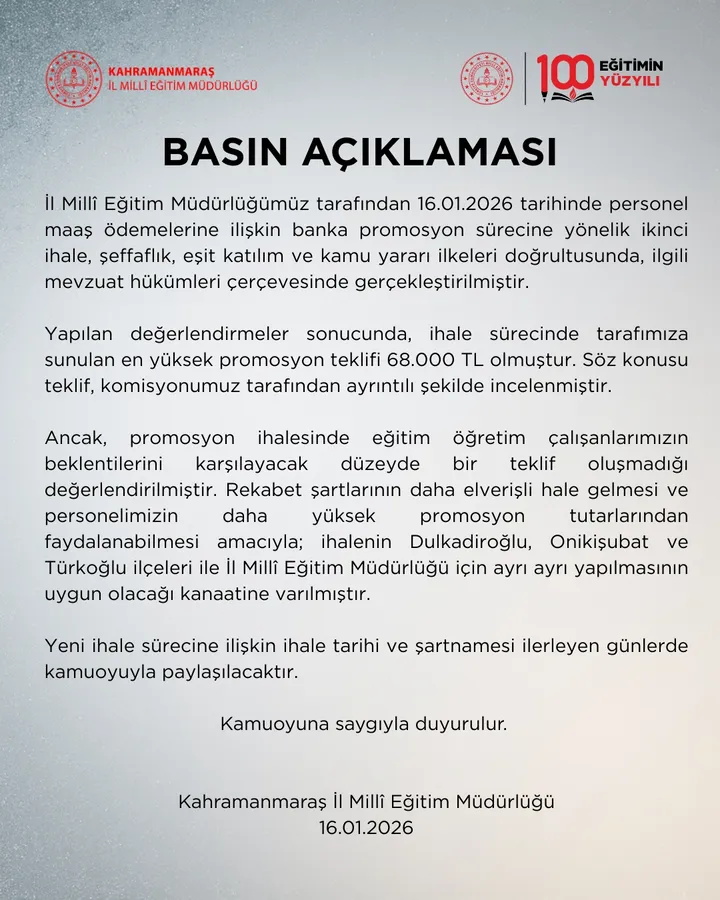 İl Millî Eğitim Müdürlüğümüz tarafından 16.01.2026 tarihinde personel maaş ödemelerine ilişkin banka promosyon sürecine yönelik ikinci ihale, şeffaflık, eşit katılım ve kamu yararı ilkeleri doğrultusunda, ilgili mevzuat hükümleri çerçevesinde gerçekleştirilmiştir.