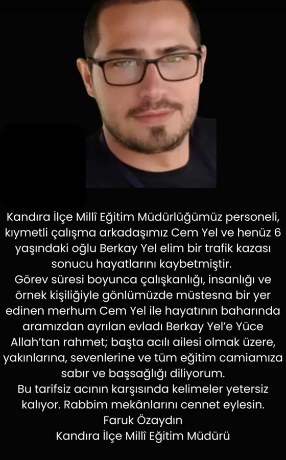 "Kandıra İlçe Milli Eğitim Müdürlüğümüz personeli, kıymetli çalışma arkadaşımız Cem Yel ve henüz 6 yaşındaki oğlu Berkay Yel elim bir trafik kazası sonucu hayatlarını kaybetmiştir. Görev süresi boyunca çalışkanlığı, insanlığı ve örnek kişiliğiyle gönlümüzde müstesna bir yer edinen merhum Cem Yel ile hayatının baharında aramızdan ayrılan evladı Berkay Yel'e Yüce Allah'tan rahmet; başta acılı ailesi olmak üzere, yakınlarına, sevenlerine ve tüm eğitim camiamıza sabır ve başsağlığı diliyorum. Bu tarifsiz acının karşısında kelimeler yetersiz kalıyor. Rabbim mekânlarını cennet eylesin."