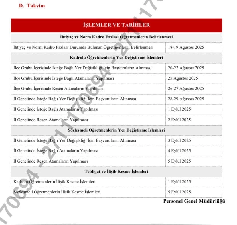 Yer değiştirme sürecinin ilk adımı, 18–19 Ağustos tarihlerinde norm kadro fazlası öğretmenlerin tespit edilmesiyle atılacak. Bu kapsamda ihtiyaç fazlası pozisyonlardaki öğretmenler resmi olarak belirlenecek.