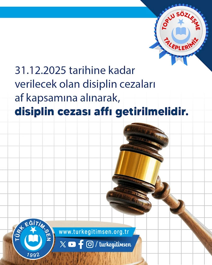 Türk Eğitim-Sen, 8. Dönem Toplu Sözleşme görüşmeleri öncesinde duyurduğu talepler arasında, öğretmenlerin uzun süredir beklediği bir konuya yer verdi. Sendika, sosyal ve ekonomik hakların yanı sıra, "31.12.2024 tarihine kadar verilecek olan disiplin cezaları af kapsamına alınarak disiplin cezası affı getirilmelidir" talebini dile getirdi.