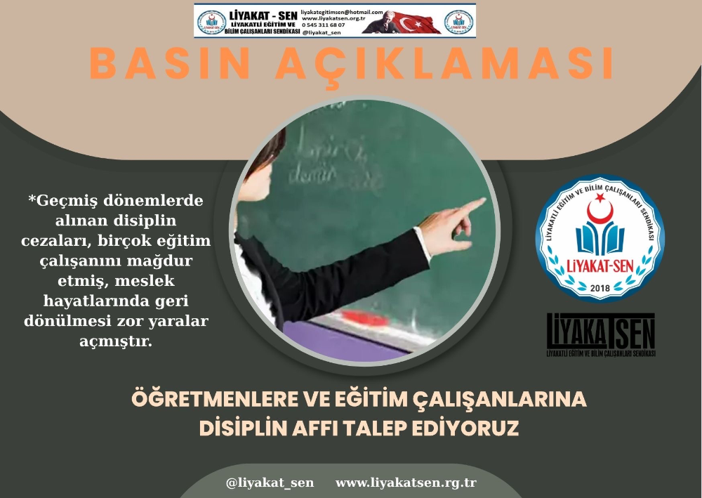 Liyakatli Eğitim ve Bilim Çalışanları Sendikası olarak, öğretmenlerimiz ve eğitim çalışanlarımız için geniş kapsamlı bir disiplin affı getirilmesini talep ediyoruz. Bu af ile birlikte, geçmişte çeşitli sebeplerle verilen disiplin cezalarının eğitim camiasında yarattığı olumsuz etkileri gidermeyi, çalışma barışını tesis etmeyi ve eğitim çalışanlarının haklarını korumayı amaçlıyoruz.