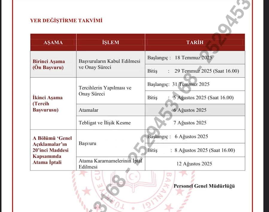 Önemli Uyarı: Başvuruların Yer Değiştirme Takviminin son günlerinde yapılması durumunda hatalı ya da eksik belge sebebiyle reddedilenlerin yeniden başvuru yapma durumu mümkün olamayabileceğinden, öğretmenlerin başvurularını olabildiğince erken yapmaları ve onay/ret işlemlerini başvuru sistemi üzerinden takip etmeleri önemle duyurulur.