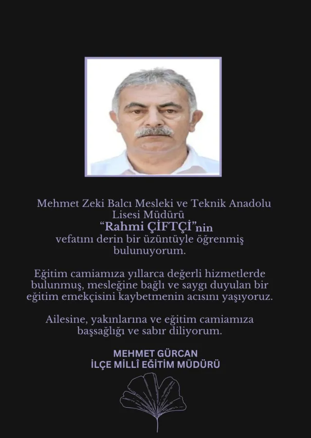 "Mehmet Zeki Balcı Mesleki ve Teknik Anadolu Lisesi Müdürü Rahmi Çiftçi’nin vefatını derin bir üzüntüyle öğrenmiş bulunuyorum. Eğitim camiamıza yıllarca değerli hizmetlerde bulunmuş, mesleğine bağlı ve saygı duyulan bir eğitim emekçisini kaybetmenin acısını yaşıyoruz. Merhuma Allah'tan rahmet; ailesine, yakınlarına ve tüm eğitim camiamıza başsağlığı ve sabır diliyorum."