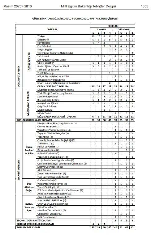 Milli Eğitim Bakanlığı (MEB) bünyesindeki Güzel Sanatlar Müzik İlkokulu ve Ortaokulu'nun haftalık ders çizelgesi, 2025-2026 eğitim ve öğretim yılından itibaren geçerli olmak üzere yeniden düzenlendi. Yeni çizelge, Bakanlığın Kasım Ayı Tebliğler Dergisi'nde yayımlanarak resmiyet kazandı.
