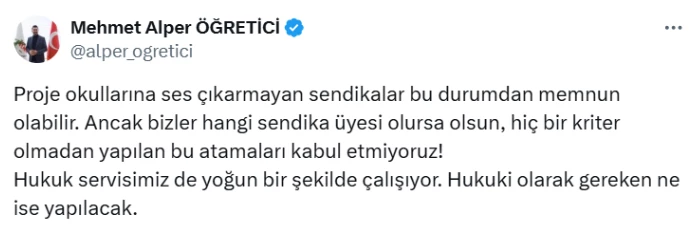 Öğretici, "Proje okullarına ses çıkarmayan sendikalar bu durumdan memnun olabilir. Ancak bizler hangi sendika üyesi olursa olsun, hiçbir kriter olmadan yapılan bu atamaları kabul etmiyoruz!" diyerek, hukuki sürecin başlatılacağını ifade etti. Bu açıklama, eğitimde liyakat ve şeffaflık taleplerini bir kez daha gündeme taşıdı.