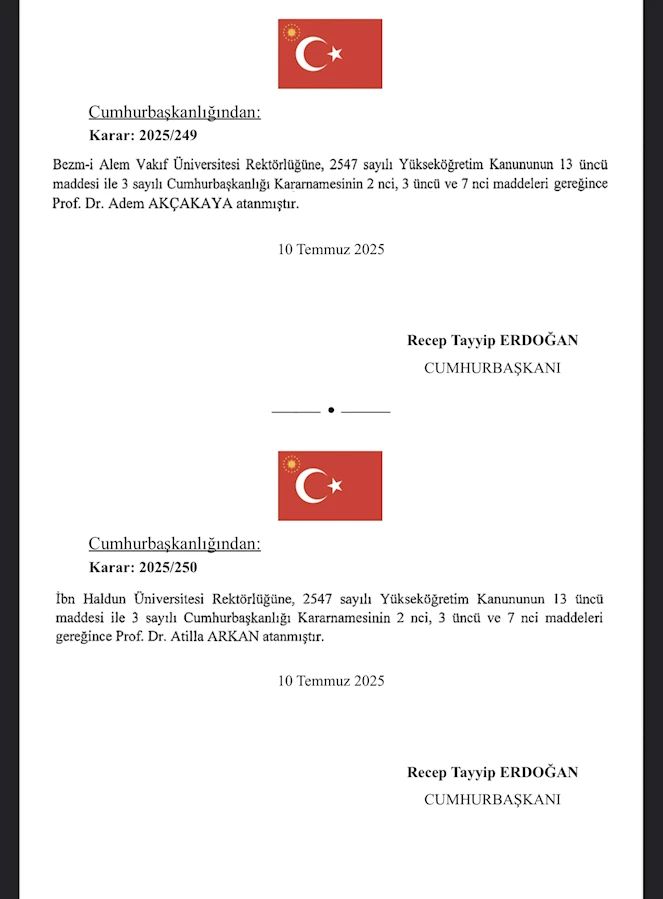 Bu atamalar, ilgili üniversitelerin akademik ve idari yönetimlerinde yeni bir dönemin başlangıcını temsil ediyor. Tüm atamalar 10 Temmuz 2025 tarihinde Cumhurbaşkanı Recep Tayyip Erdoğan tarafından imzalanarak Resmi Gazete'de yayımlandı.