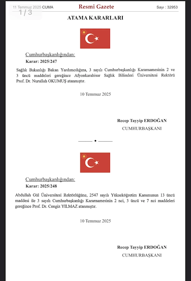 Ankara - Cumhurbaşkanı Recep Tayyip Erdoğan'ın imzasıyla Resmi Gazete'de yayımlanan atama kararlarıyla, Sağlık Bakanlığı Bakan Yardımcılığı görevine ve bazı vakıf üniversitelerinin rektörlüklerine yeni isimler getirildi. 11 Temmuz 2025 tarihli Resmi Gazete'de yer alan kararlar, kamu ve eğitim camiasında önemli değişikliklere işaret ediyor.