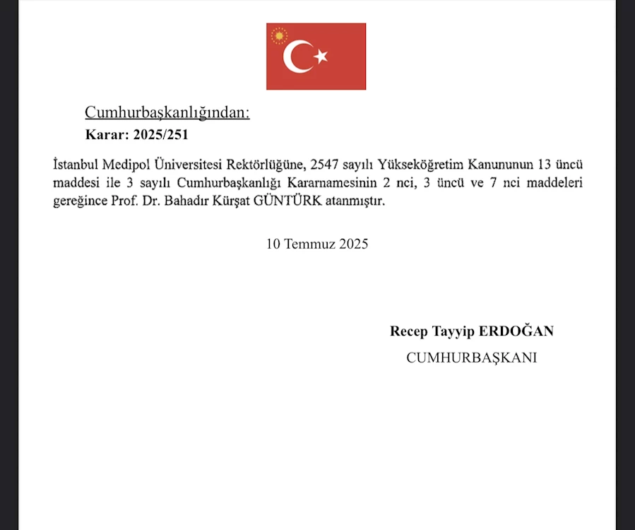 İstanbul Medipol Üniversitesi Rektörlüğü'ne 2025/251 sayılı karar ile Prof. Dr. Ömer Ceran atandı.
