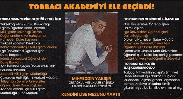 Soruşturmanın en akıl almaz ayrıntılarından biri, 29 yaşındaki Mıhyeddin Yakışır'ın hikayesi oldu. Ortaokul mezunu olan ve Adana'da uyuşturucu satıcılığı suçundan kaydı bulunan Yakışır, çete aracılığıyla sahte lise diploması ve e-imza temin etti.