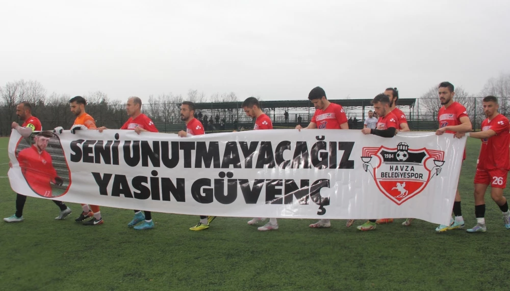 Havza Belediyespor formasını giyen Güvenç için takım arkadaşları ile rakip oyuncular ilçe stadında sahaya "Seni Asla Unutmayacağız Yasın Güvenç" yazılı pankart ile çıktı.