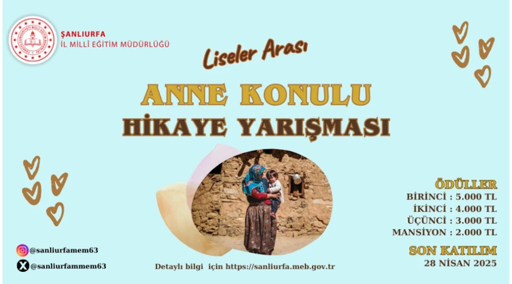 Şanlıurfa İl Milli Eğitim Müdürlüğü, lise öğrencilerine yönelik 'Anne' konulu ödüllü hikaye yarışması düzenliyor. Bu özel yarışma, öğrencilere yaratıcı yazma becerilerini geliştirme ve aile değerlerine dair farkındalık kazandırmayı amaçlıyor.