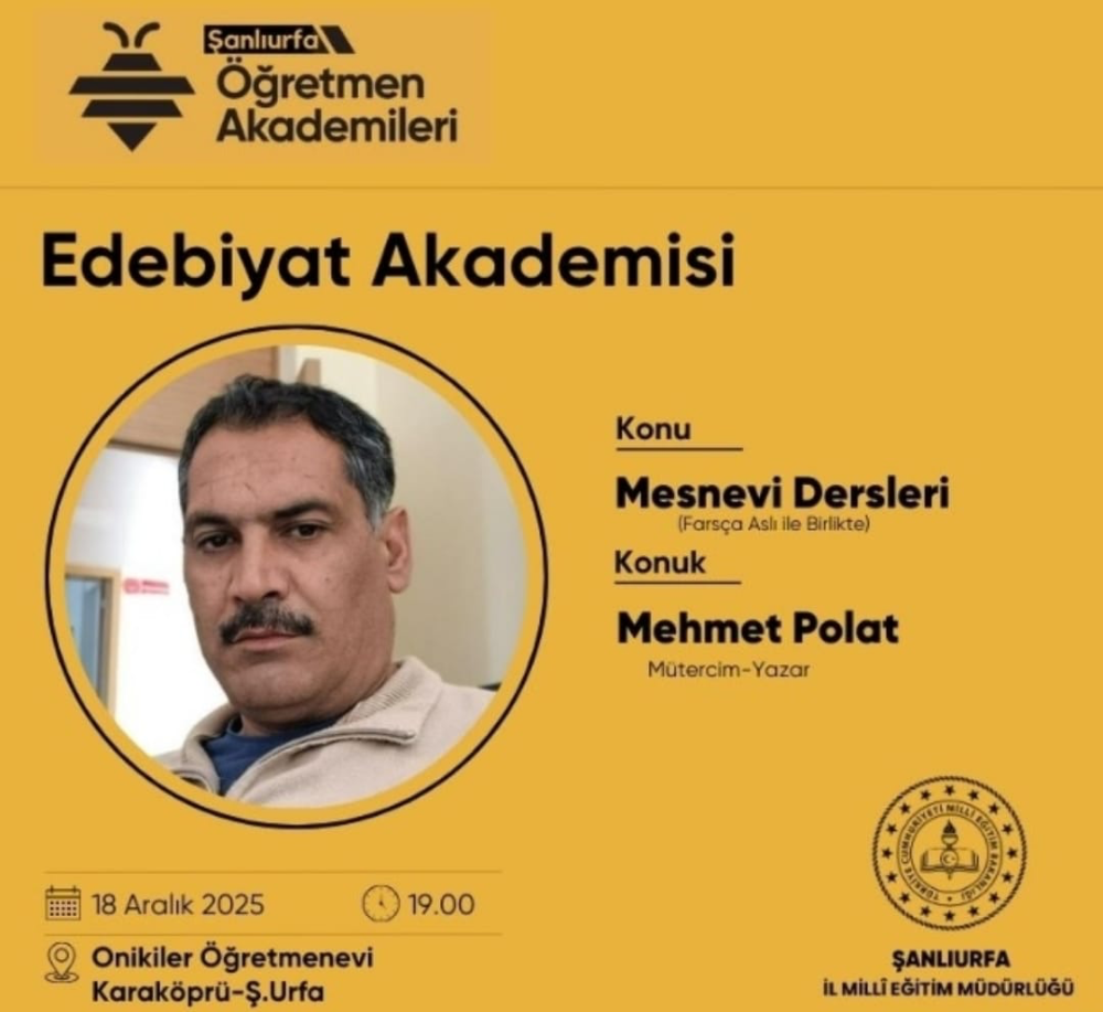 Karaköprü Onikiler Öğretmenevi’nde gerçekleştirilen programda, Mevlânâ Mesnevisi ele alındı. Mütercim-yazar Mehmet Polat, Mevlânâ’yı düşünce dünyası, tasavvuf anlayışı ve edebî kişiliğiyle çeşitli yönleriyle değerlendirdi. Programın devamında Polat, Mesnevî’nin ilk 18 beytini öğretmenlerle birlikte tahlil ederek metnin anlam derinliğine dair önemli açıklamalarda bulundu.