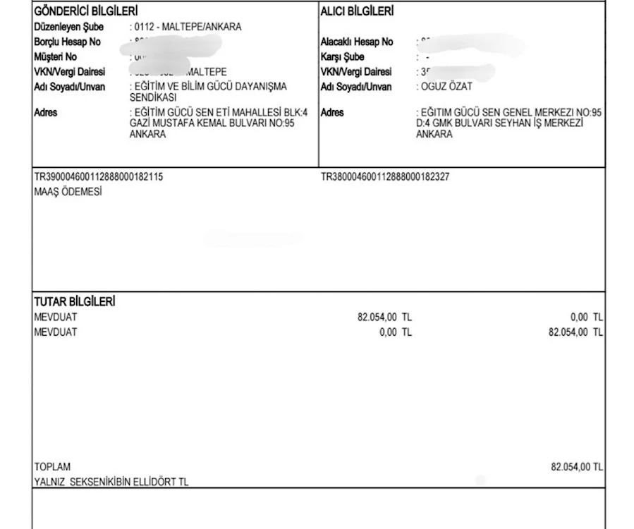 Özat'ın paylaştığı bilgilerde yer alan "MEVDUAT" başlığı altında "82.054,00 TL" ve "TOPLAM YALNIZ SEKSENİKİBİN ELLİDÖRT TL" ifadeleri, belirtilen tutarın hesabına yatırılan net miktar olduğunu ortaya koyuyor.