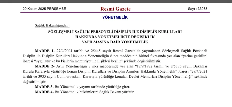 Sağlık Bakanlığı, sözleşmeli sağlık personelinin disiplin süreçlerini düzenleyen yönetmelikte önemli değişikliklere gitti. 20 Kasım 2025 tarihli ve 33083 sayılı Resmî Gazete’de yayımlanan yeni yönetmelik ile disiplin cezalarının uygulanma şekli ve yasal dayanaklarda güncelleme yapıldı.