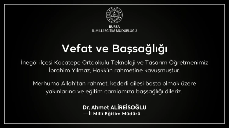 Bursa İl Milli Eğitim Müdürlüğü, merhum öğretmen İbrahim Yılmaz için bir başsağlığı mesajı yayımladı. Mesajda, "İnegöl Kocatepe Ortaokulu Teknoloji ve Tasarım Öğretmenimiz İbrahim Yılmaz vefat etmiştir. Öğretmenimize Allah'tan rahmet, ailesine, sevenlerine ve eğitim camiamıza başsağlığı dileriz" ifadelerine yer verildi.