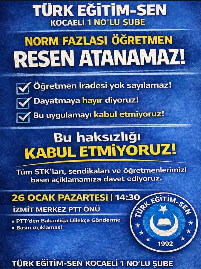 Türk Eğitim-Sen Kocaeli 1 No’lu Şube, norm fazlası öğretmenlerin kendi rızaları dışında (resen) atanmasına karşı sert bir duruş sergileyerek İzmit’te basın açıklaması ve dilekçe eylemi gerçekleştireceğini duyurdu.
