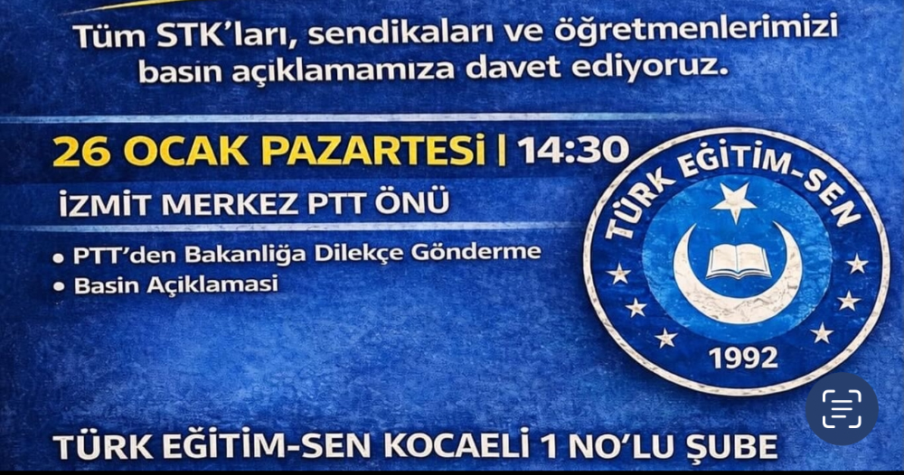 Türk Eğitim-Sen Kocaeli 1 No’lu Şube, sadece söylemle kalmayıp konuyu somut bir eyleme taşıyor. Tüm sivil toplum kuruluşlarını (STK), diğer sendikaları ve öğretmenleri davet eden şube, Milli Eğitim Bakanlığı’na gönderilecek dilekçelerle tepkisini dile getirecek.
