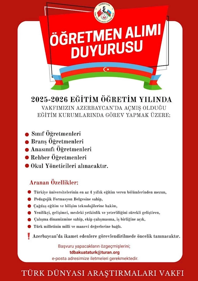 Azerbaycan’da görev almak isteyen Türk öğretmenler için heyecan verici bir fırsat doğdu. Türk Dünyası Araştırmaları Vakfı, 2025-2026 eğitim öğretim yılında Azerbaycan’daki okullarında görev alacak öğretmen ve yöneticiler için başvuru sürecini başlattı. Azerbaycan'da eğitim alanında uluslararası bir kariyer hedefleyen Türk öğretmenler için önemli bir kapı aralandı. Türk Dünyası Araştırmaları Vakfı, 2025-2026 eğitim öğretim yılında Azerbaycan'daki okullarında görevlendirmek üzere çeşitli branşlarda öğretmen ve yönetici alımı yapacağını duyurdu. İşte bu heyecan verici fırsatın tüm detayları, başvuru şartları ve süreci...