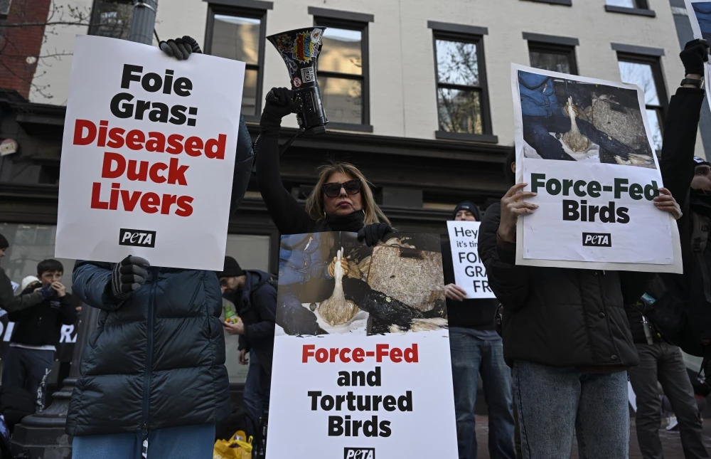 Beyaz Saray'a yakın bölgedeki Fransız restoranının önünde toplanan hayvan hakları savunucusu Humane League üyesi protestocular, ördek veya kazların zorla beslenmesiyle büyütülen ve "Foie Gras" (Yağlı karaciğer) adı verilen yiyeceği satan işletmeye karşı gösteri düzenledi.