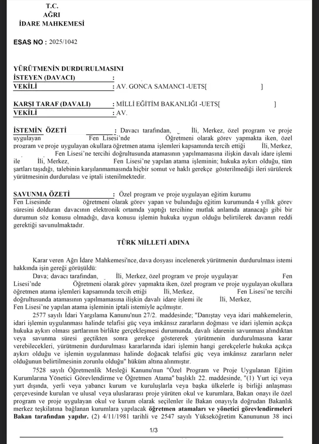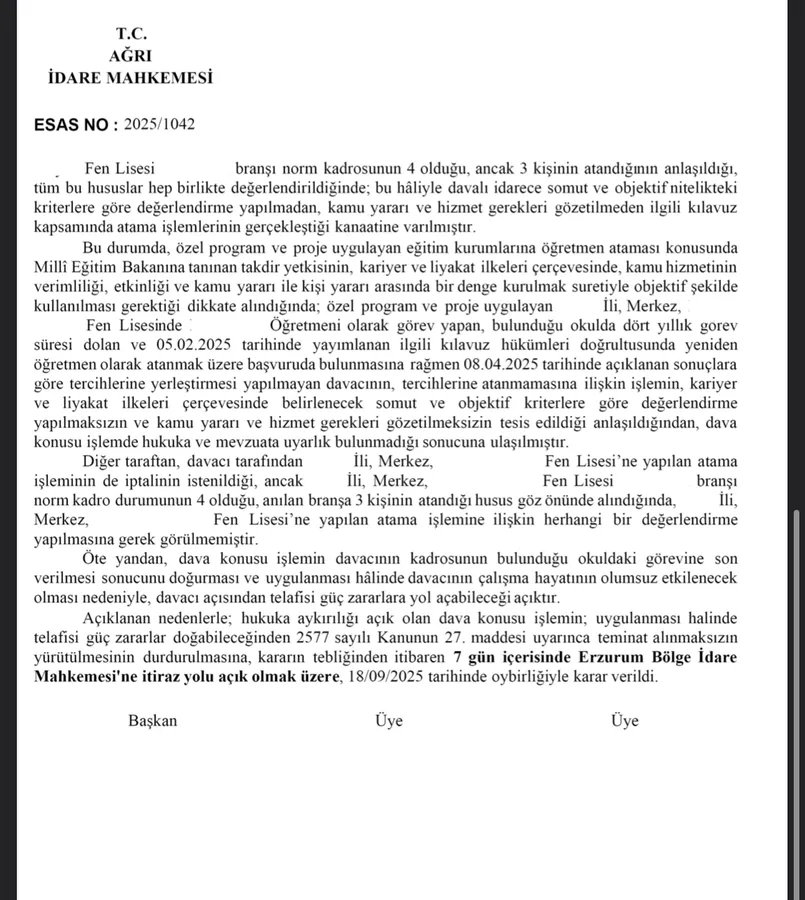 AĞRI – Özel program ve proje uygulayan eğitim kurumlarına öğretmen atamalarında yaşanan mağduriyetlere ilişkin önemli bir hukuki gelişme yaşandı. Görev süresi sona eren ve tüm şartları taşımasına rağmen kendi okuluna atanamayan bir sendika üyesi öğretmenin açtığı davada, Ağrı İdare Mahkemesi, 18 Eylül 2025 tarihli kararıyla dava konusu işlemin yürütülmesini durdurdu.